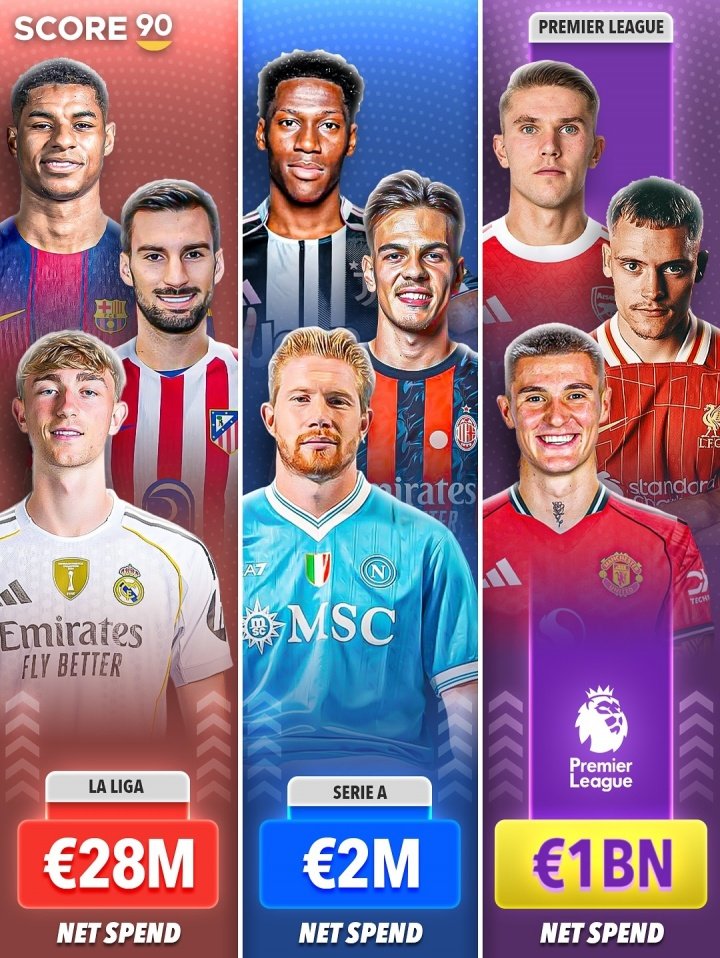 08月12日讯 外媒SCORE90统计了欧洲四大联赛在夏季转会窗的收支情况,英超以10亿欧元的净支出遥遥领先,西甲净支出2800万欧元,意甲200万欧元,德甲则在转会市场上净赚1.4亿欧元。