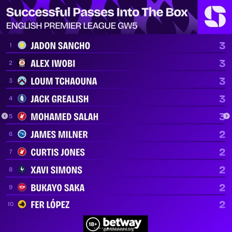 9月24日讯 英超第5轮战罢,squawkafootball列各项数据排行,桑乔等5名球员3次成功将球传入禁区,为本轮联赛最多。