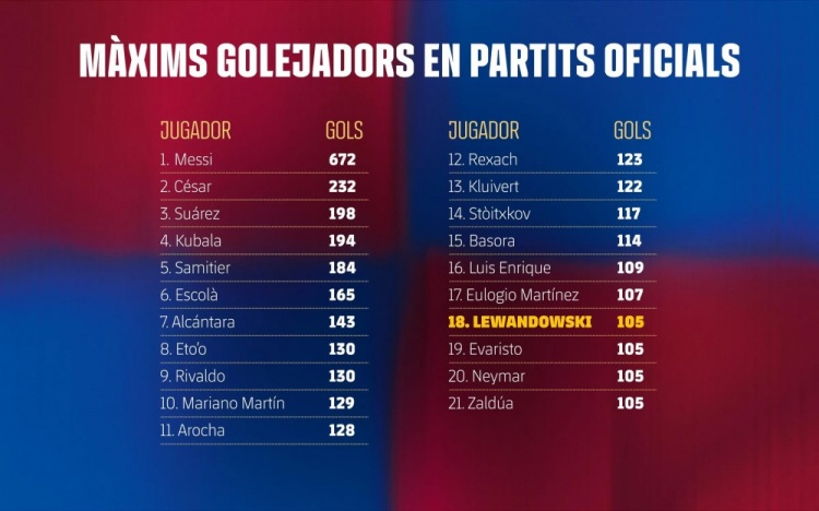 本周日的比赛同时达成了蒙锥克球场百球里程碑。此役前巴萨已在此打入99粒进球,孔德的破门成为蒙锥克球场第100球。莱万攻入第第101球,他以24球成为俱乐部在该球场的历史射手王,拉菲尼亚以15球位列次席。