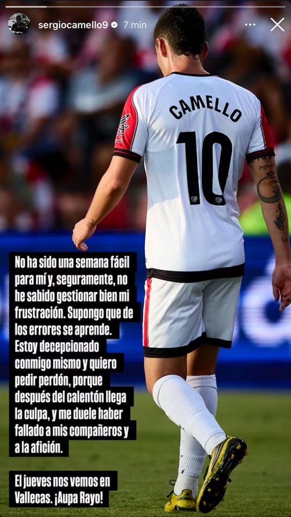 9月30日讯 在巴列卡诺0-1不敌塞维利亚的比赛中,巴列卡诺前锋卡梅洛在比赛最后阶段因辱骂主裁判曼萨诺而被红牌罚下,现在他在社交媒体发文道歉。